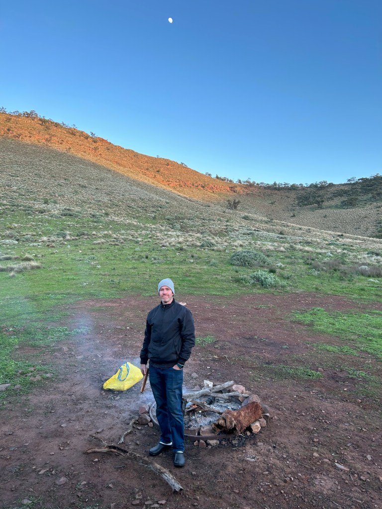 Morning sun over the ranges. Actually that’s a moon in the sky over Mitch which is a bit confusing. Mitchi Pichi Richi. We went for a quick walk before finishing the pack up, getting up the hills we’d been eyeing off for two days.Coo-eeeee! Very cool rocks. Some geologist please explain these to me.Rare Bennetts Wallaby sightingSee ya!
