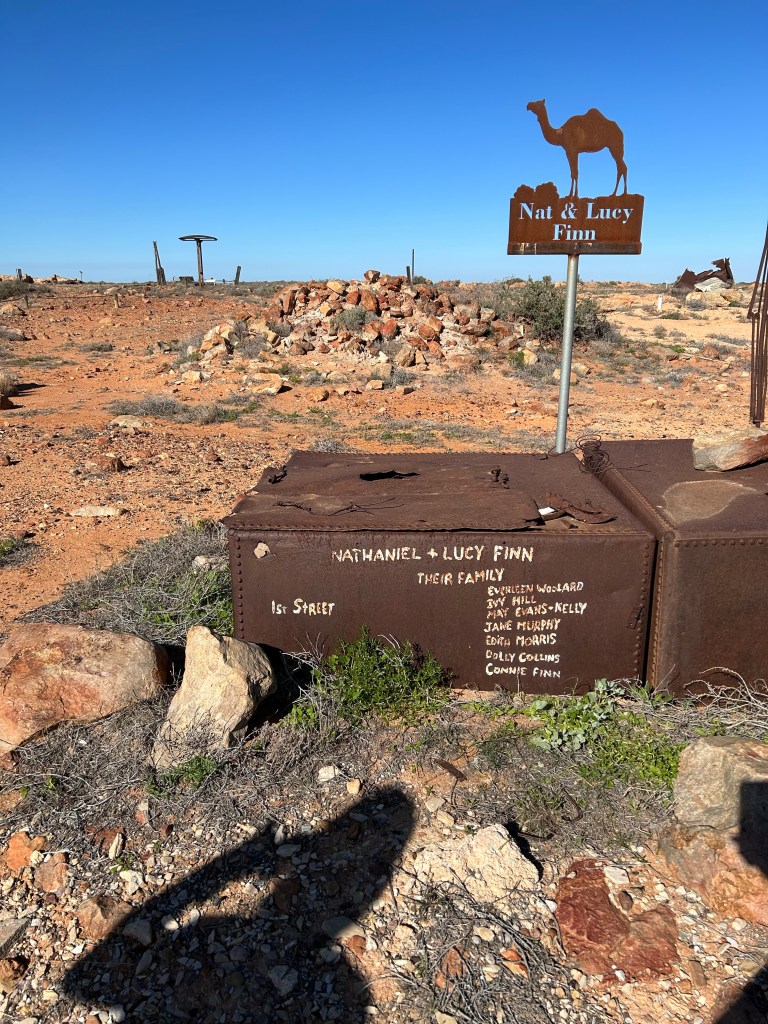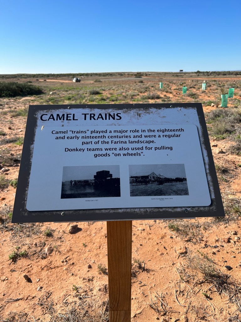 See, absolutely packed. Every nook and cranny had historical artefacts and placards and the bakery offered a bevy of doughy options: cinnamon scrolls, meat pies and pasties, cookies and bread. All pretty impressive really.Bakery from the outside. The old post office. The Finn house, still showing inscriptions of the seven daughters who lived there.Camels are a constant throughline in the Outback. I am fascinated in their stories and that of the mostly Afghan cameleers who introduced them after reading The Ballad of Abdul Wade by Ryan Butta.All that remains of the Anglican Church.Farewell Farina!