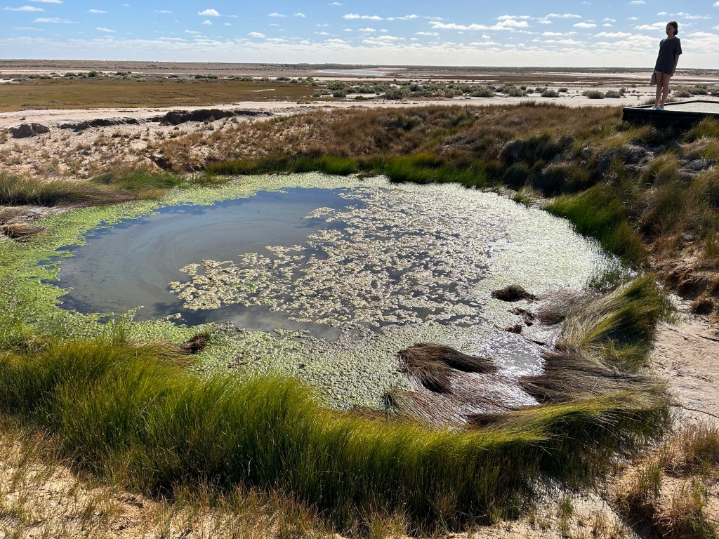 Coward Springs is located in the Wabma Kadarbu Mound Springs Conservation Park, and we took a small trip to inspect them. The are significant to the Arabana people as part of a Dreamtime story, translating to ‘snake head.’ After being hunted, the snake’s body was thrown down on the ground creating the natural artesian hot spring.