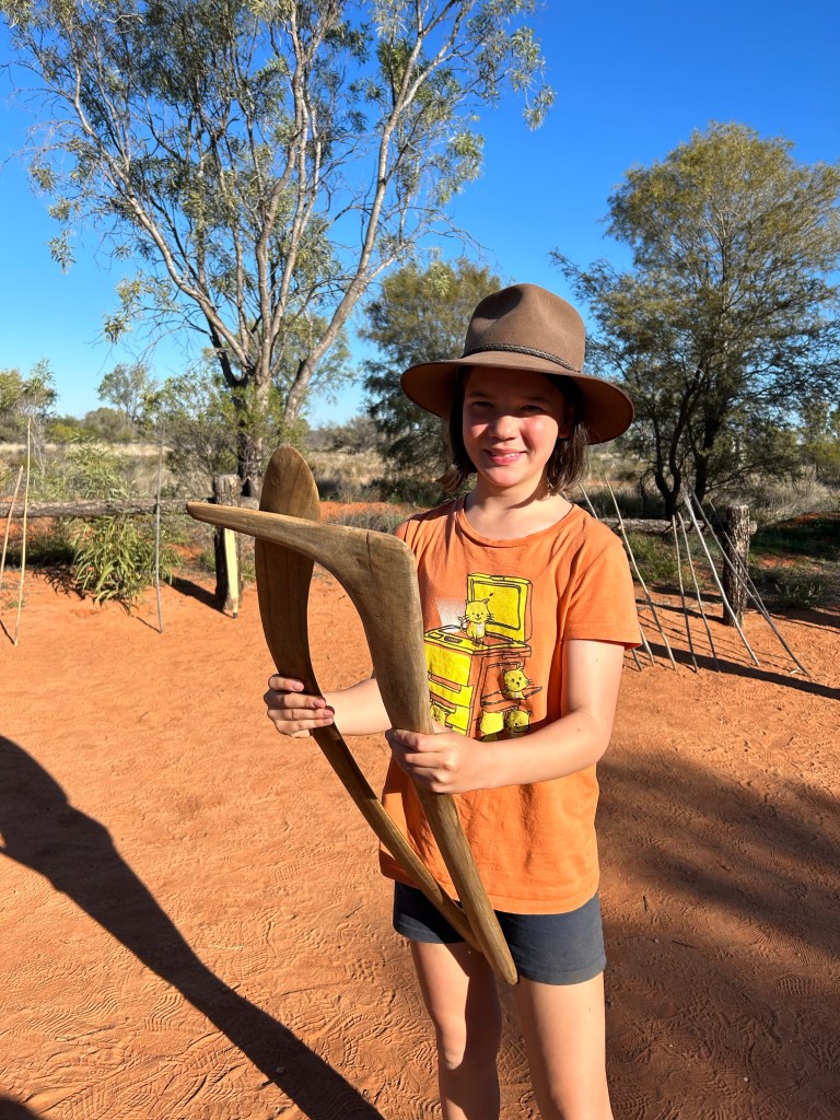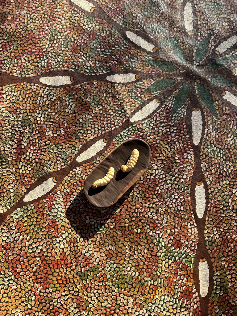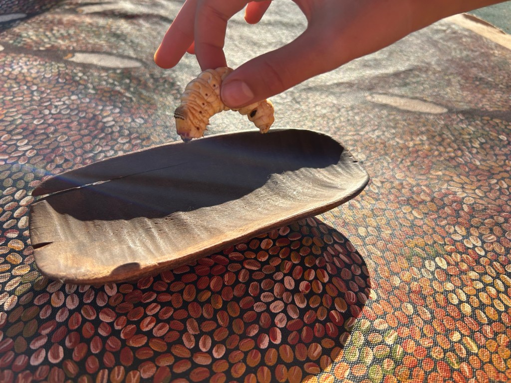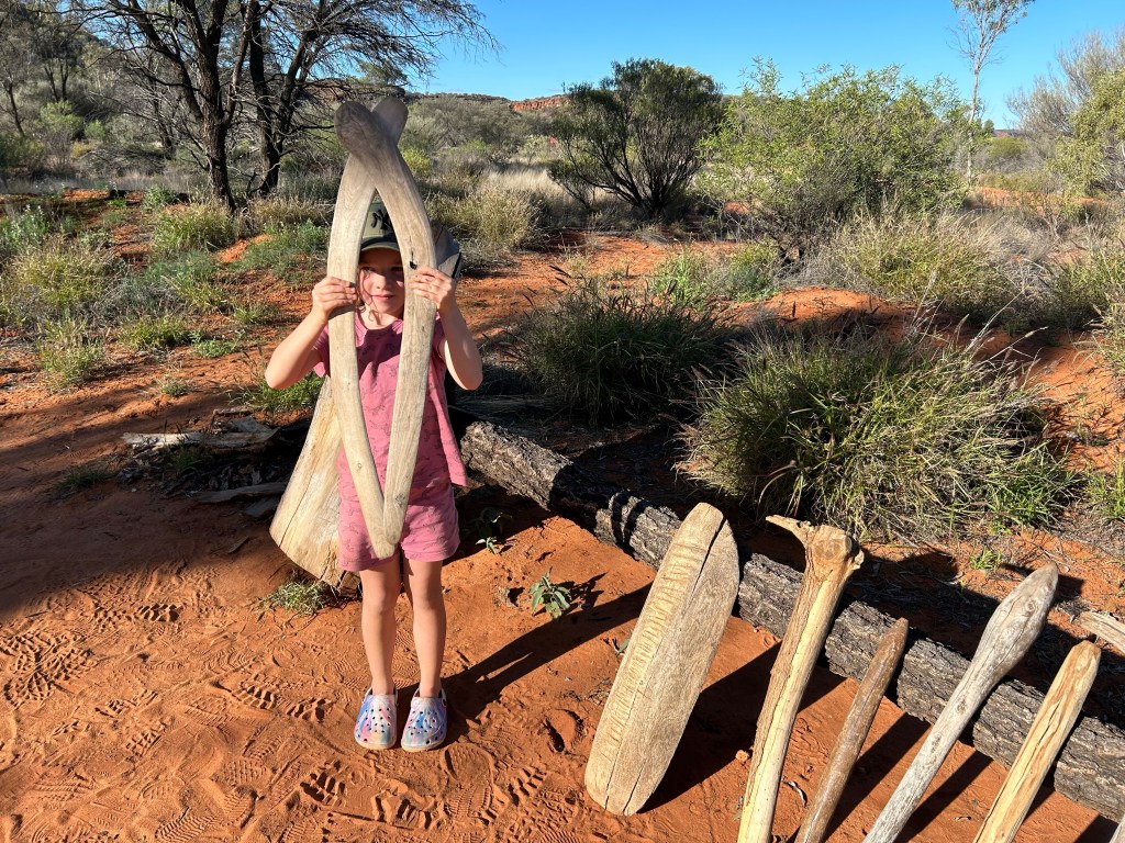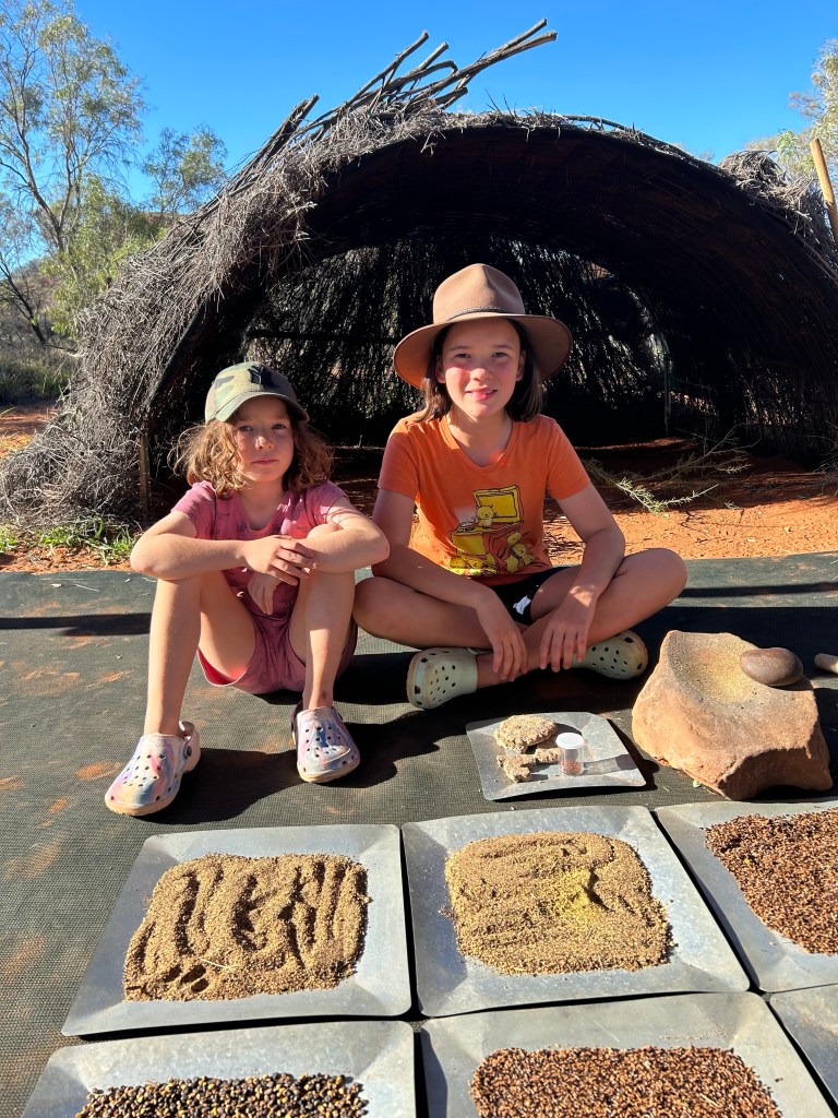 First we learnt about the use of ground acacia seeds in baking. Then, men’s weapons. This is a non-returning boomerang. We were allowed to touch them as they hadn’t been used in any initiation ceremonies. The meaning and significance of dot painting. Based on earlier and ongoing forms of symbolic language, drawn in sand and then rubbed out once communicated.This particular painting was about the witchetty grub, the trees it could be found in, and the country around it. Oli really wanted a nibble of this one!Ochre and oxides. Next Natasha shared her art-making using dried seeds and repurposed fencing wire as etching tool. And then bush tucker! These are honey ants. They were so dopey, I was expecting them to be combative and cranky for some reason.Bush bananas.