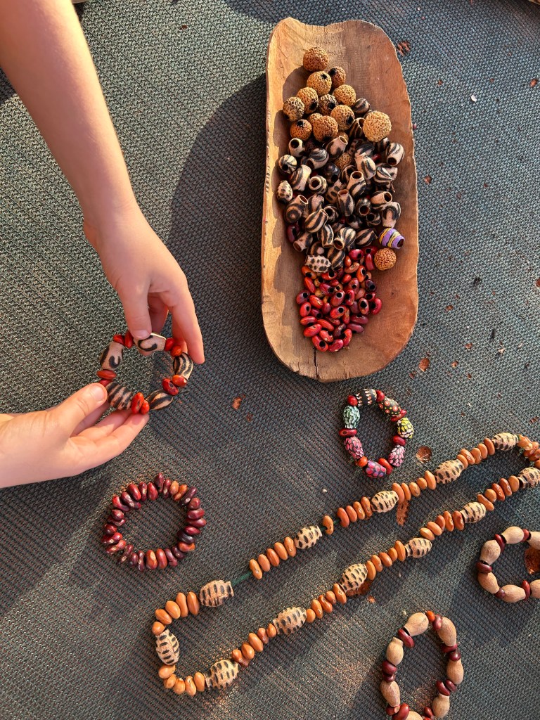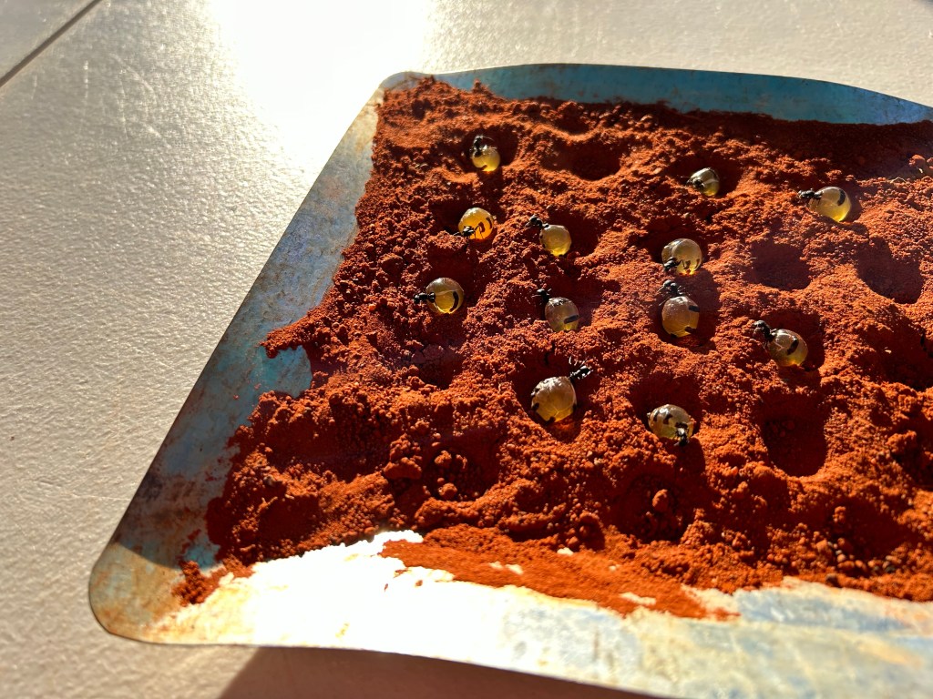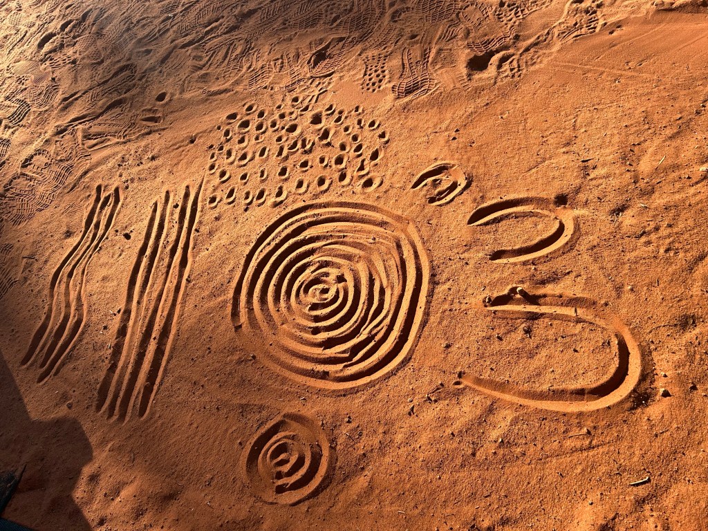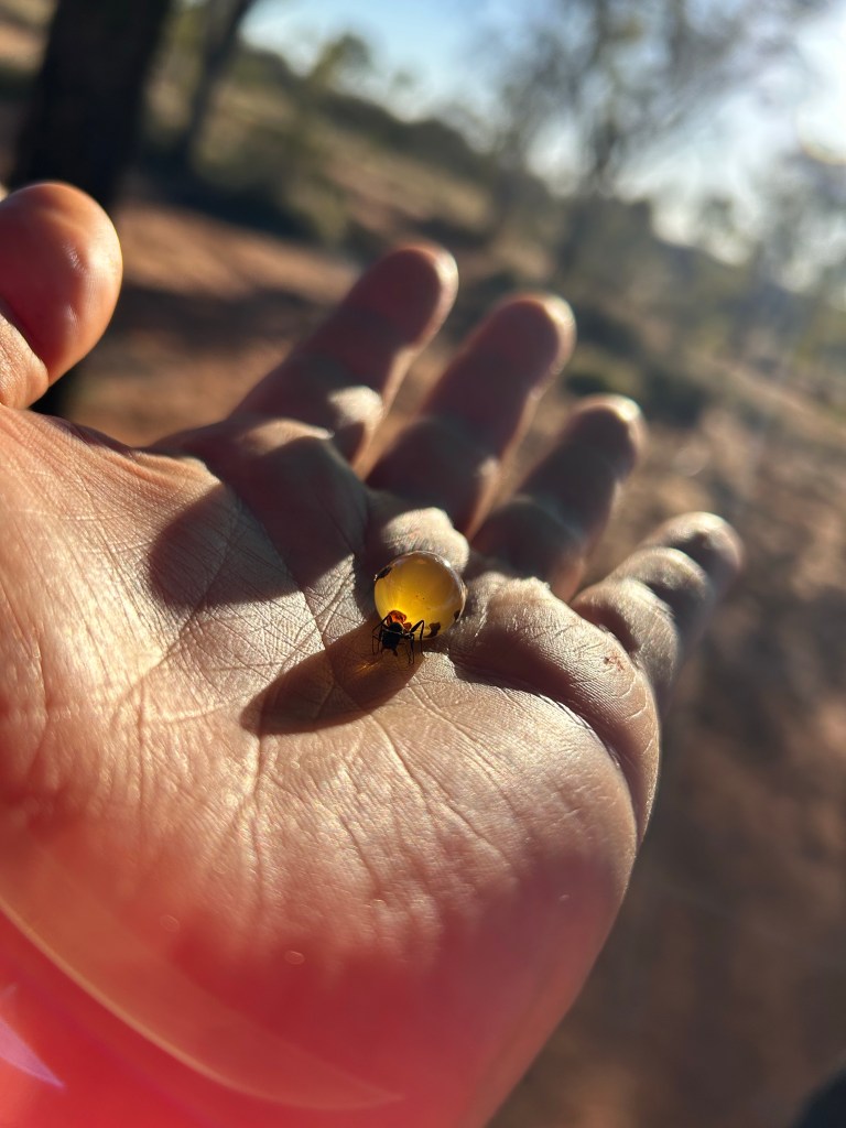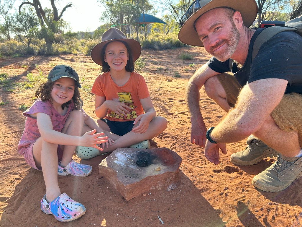 First we learnt about the use of ground acacia seeds in baking. Then, men’s weapons. This is a non-returning boomerang. We were allowed to touch them as they hadn’t been used in any initiation ceremonies. The meaning and significance of dot painting. Based on earlier and ongoing forms of symbolic language, drawn in sand and then rubbed out once communicated.This particular painting was about the witchetty grub, the trees it could be found in, and the country around it. Oli really wanted a nibble of this one!Ochre and oxides. Next Natasha shared her art-making using dried seeds and repurposed fencing wire as etching tool. And then bush tucker! These are honey ants. They were so dopey, I was expecting them to be combative and cranky for some reason.Bush bananas.