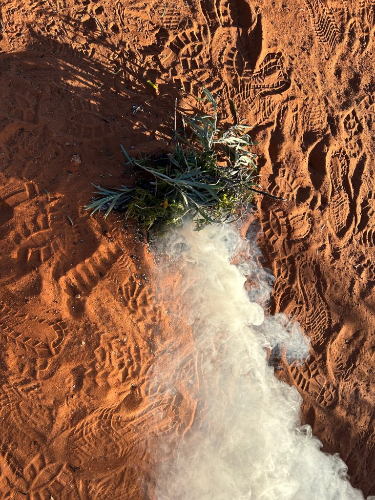 Finally, bush medicine, and how ceremonies are concluded: smoke.Hard to see, but the slimmest of crescent moons rising on the horizon.
