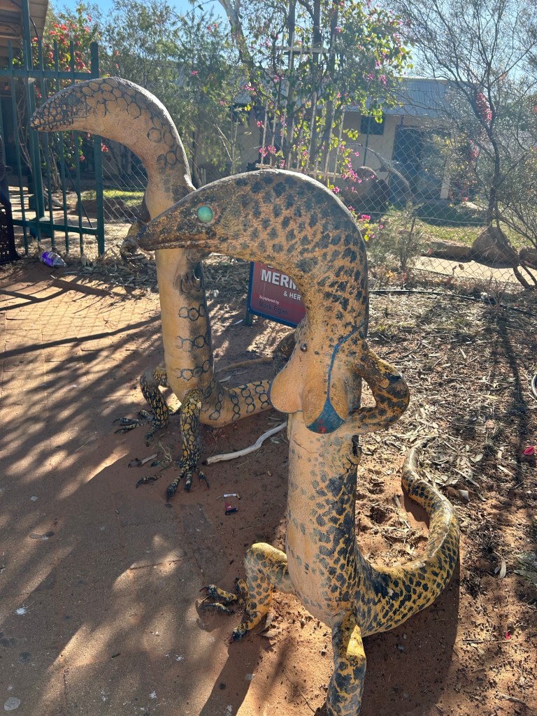 Some roadhouses are stranger than others. This one (Aileron) had some interesting sculptures, a camel paddock, resident peacocks, and one old bloke smoking in the bar.